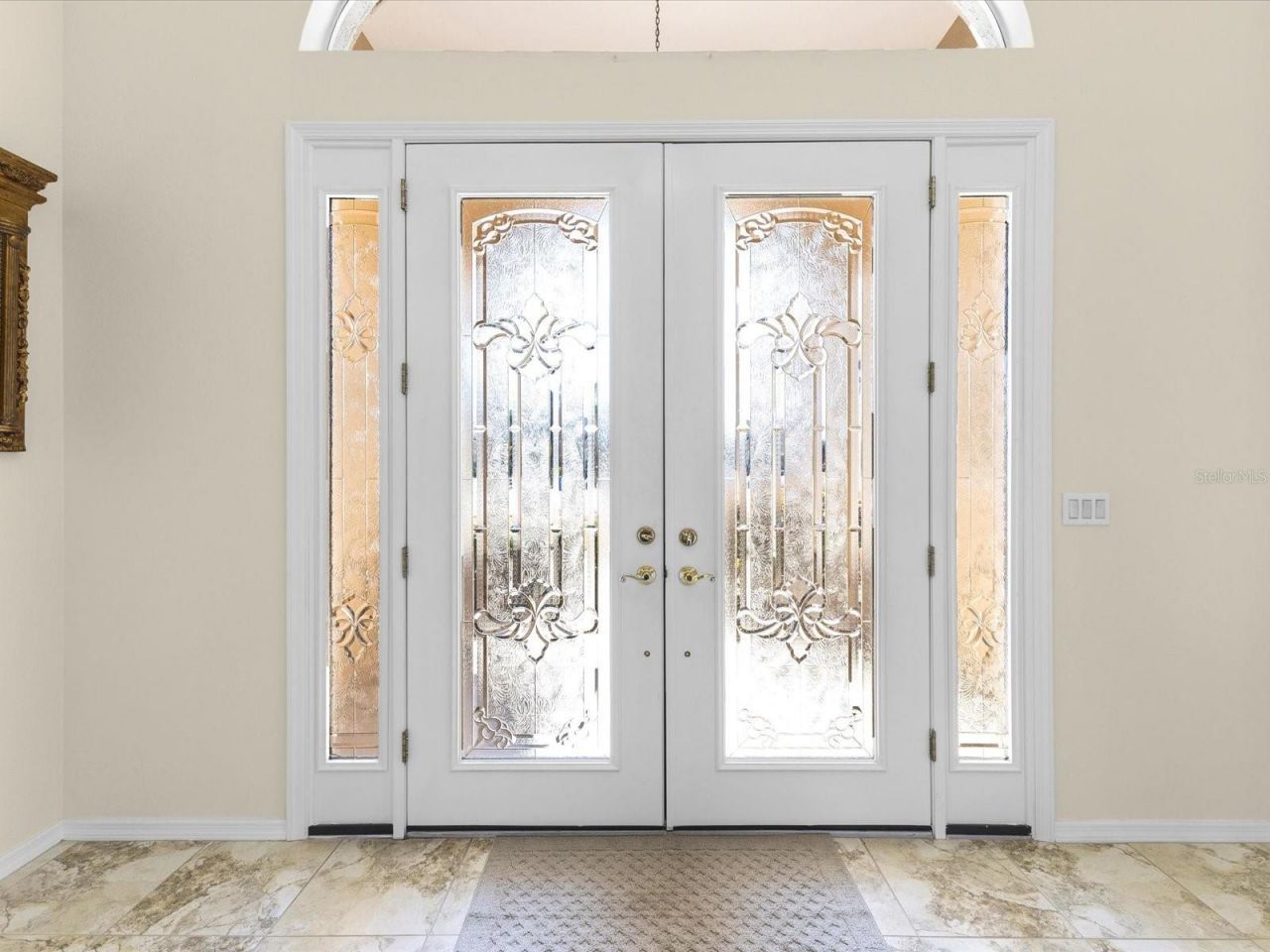 Welcome to 13417 Whitehaven Court in the gated community of Pristine Place - where Florida living feels effortless, refined, and refreshingly spacious.If you're relocating, this home delivers exactly what you've been picturing: soaring ceilings, natural light pouring through custom arched windows, and a layout that feels open without losing warmth.Step through the double leaded glass entry doors and into a residence that has been thoughtfully enhanced for truly turnkey living. In 2024, the home received extensive updates, including new SMARTCORE Ultra wood polymer composite flooring in the formal living room, dining room, and all three bedrooms, crown molding installed throughout the entire home, complete interior and exterior repainting, and a beautifully refreshed kitchen featuring new granite countertops with professional nano-ceramic coating and a new under-mount sink with commercial-style faucet.The secondary bathrooms have been updated, the laundry room features all new cabinetry, and the garage floor has been newly epoxied - creating a clean, polished feel from front door to back wall.Timeless travertine-look tile flooring carries through the foyer, hallways, kitchen, and bathrooms, blending seamlessly with the home's custom architectural details, including arched doorways, classical pillars, oversized arched windows, and a striking oval geometric window at the front of the garage. Stainless GE kitchen appliances and a newer water heater (2019) add even more peace of mind.The tiled front walkway, porch, and rear oversized (12'X25') screened lanai invite you outdoors, while double glass-paneled doors from the eat-in kitchen create a natural flow between interior comfort and Florida sunshine.What truly sets this home apart is its thoughtful accessibility design. Originally customized with long-term comfort in mind, it includes an extra-wide 48-inch walkway to the front entrance, an oversized two-car garage for easy vehicle access, extra-wide hallways throughout, a zero-entry shower in the primary bathroom, safety bars in both bathrooms, and a portable ramp in the garage.This is where you change your winter boots into summer sandals once and for all. Florida living done beautifully.